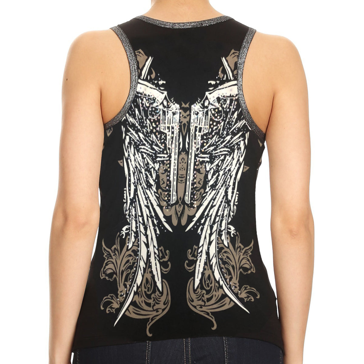 Super flattering zip-up, U-neck, sleeveless top with Gun & wings print, embellished in rhinestones