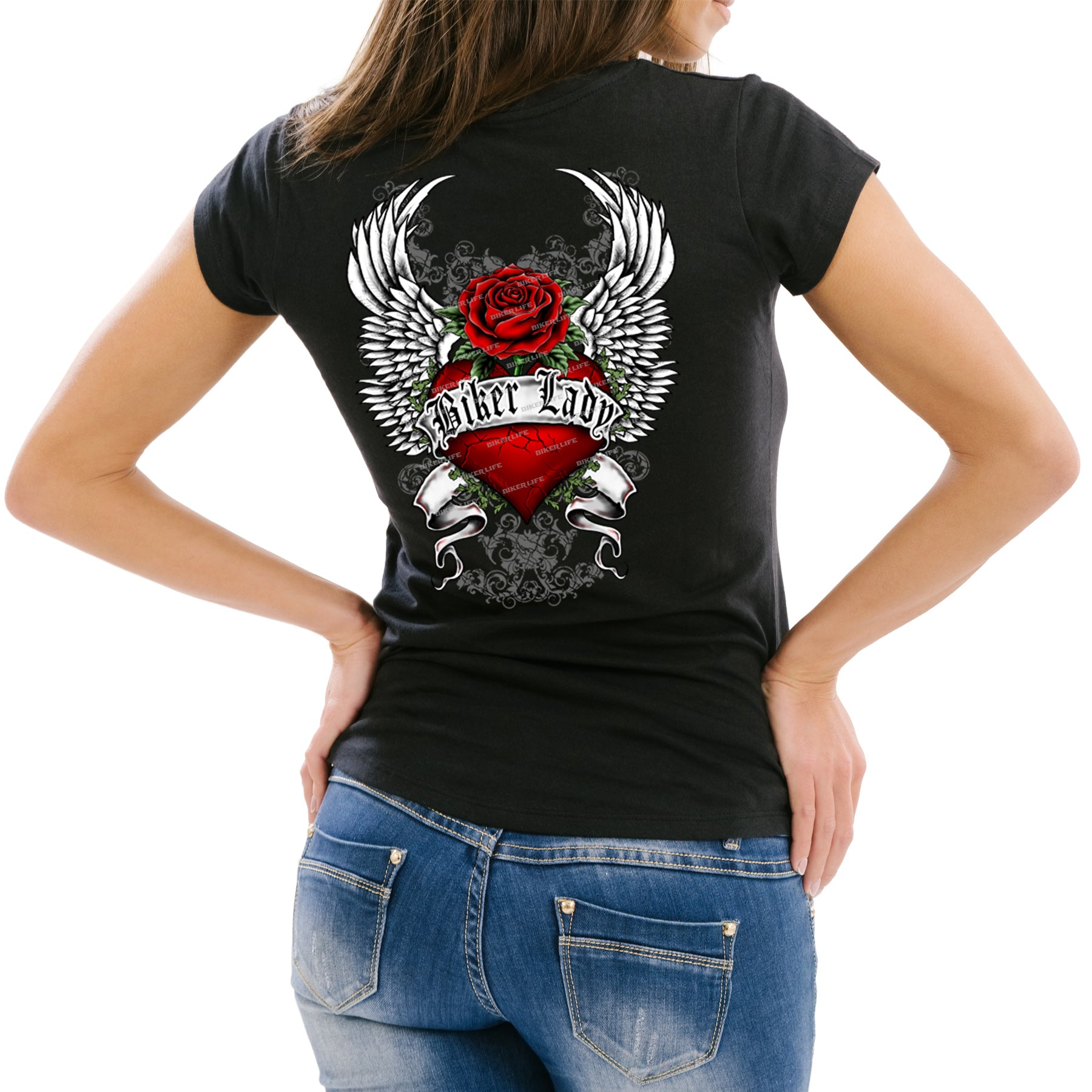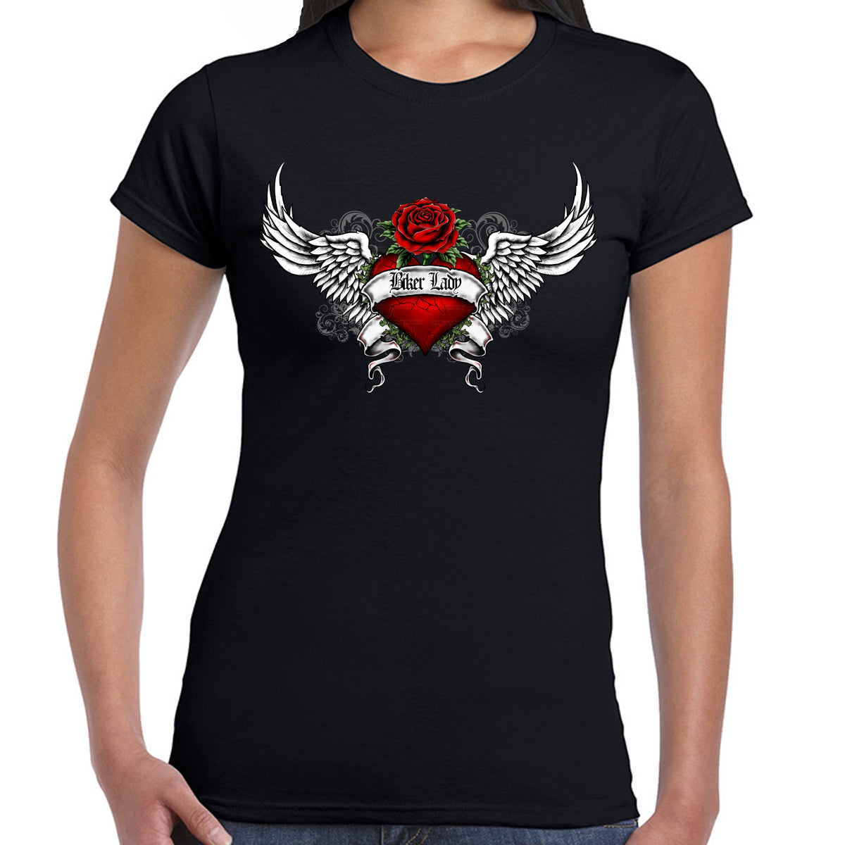 Ladies Heart Of An Angel Biker Crew Neck T-Shirt