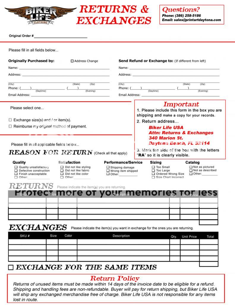 4. Print out our Returns & Exchange Form and fill out as necessary. (Example Below)